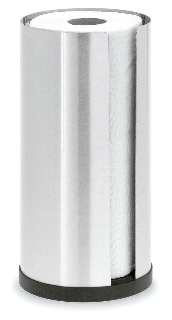 Stainless steel cylinder paper towel holder by blomus. This paper towel holder hides the towels and has a small opening to retrieve the paper towels.