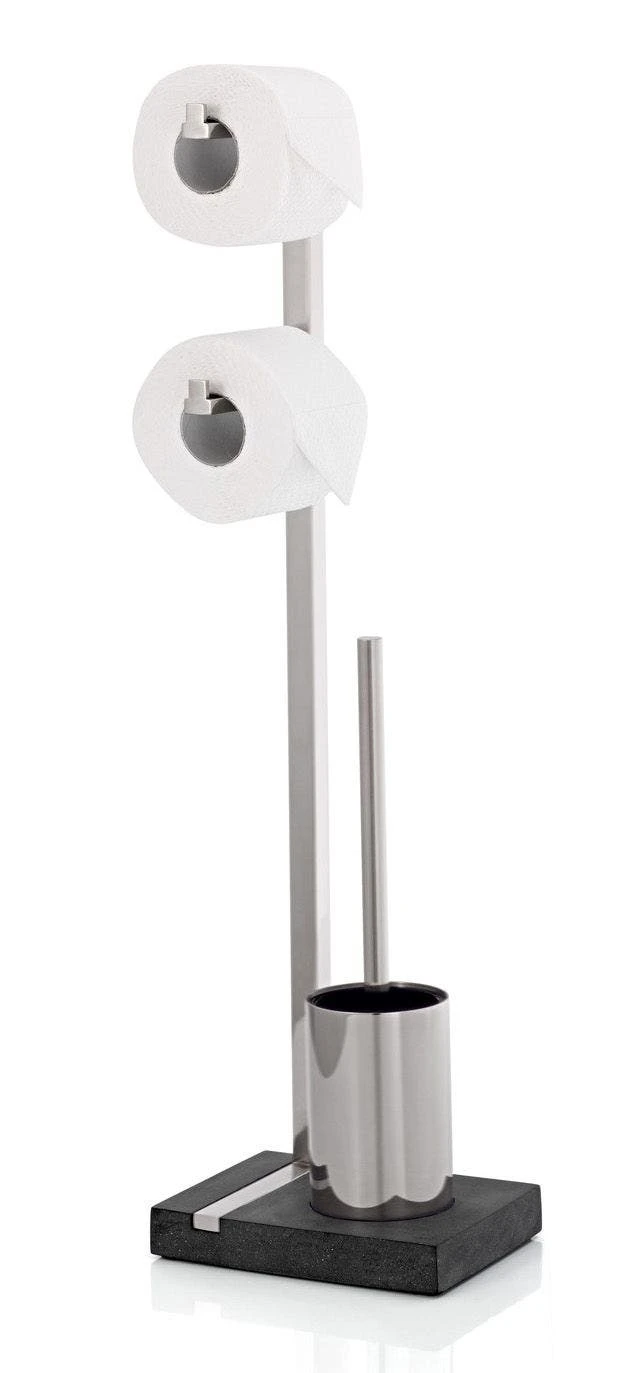 Toilet Butler – 2 Roll organization station by blomus. A clever combination of warm, dark stone with the cool elegance of stainless steel gives this unit its stylish elegant look. The balanced design of this stand successfully blends the appeal of stainless steel and cast stone. Accommodates 2 rolls of tissue paper as well as built in tray for the removable toilet brush with holder. Base is made of polystone which provides both a stylish look and support.